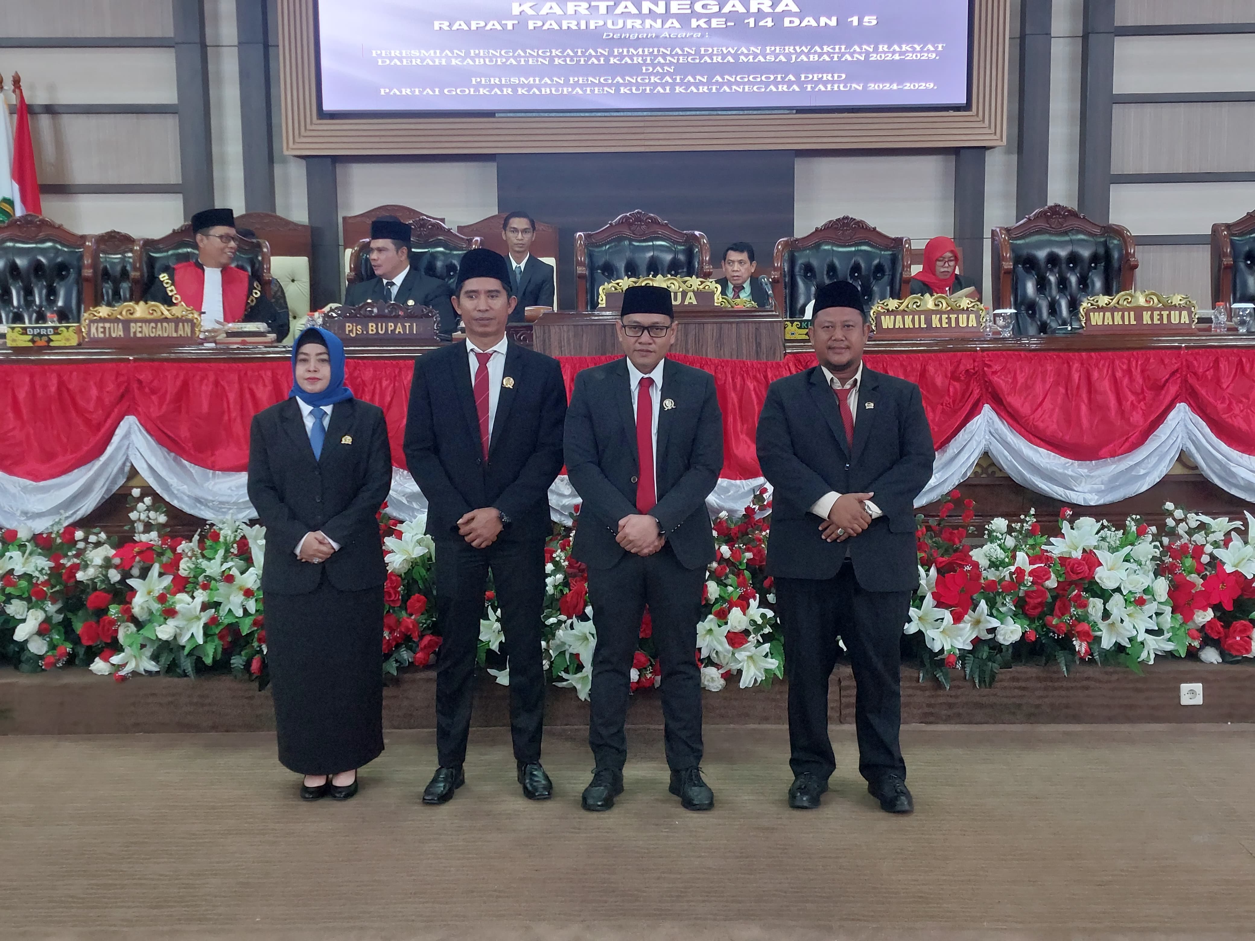 Kaltimtoday.co, Tenggarong - Empat unsur pimpinan definitif Dewan Perwakilan Rakyat Daerah Kutai Kartanegara (DPRD Kukar) resmi dikukuhkan. Junaidi dari PDI Perjuangan didapuk sebagai Ketua DPRD Kukar untuk periode 2024-2029.