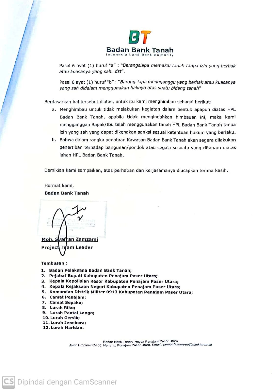 Surat imbauan itu ditandatangani Project Team Leader Bank Tanah Moh Syafran Zamzami.