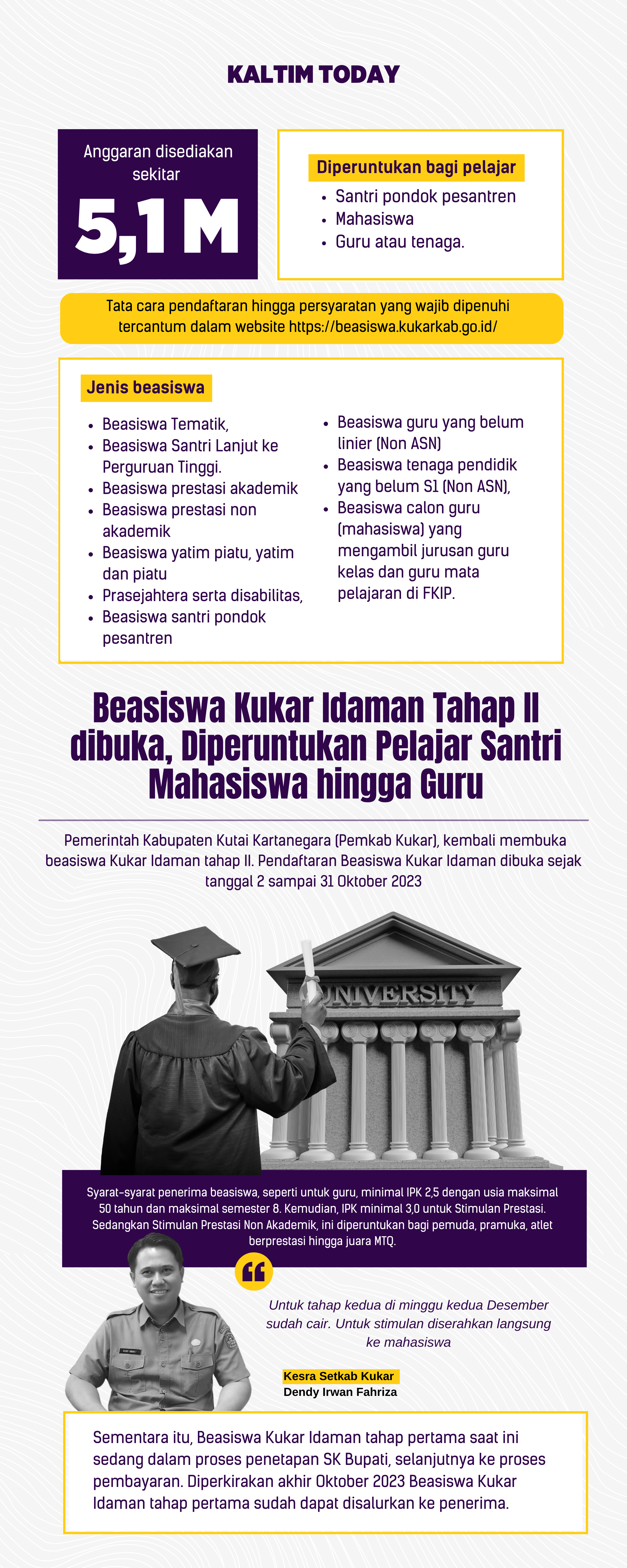Kaltimtoday.co, Tenggarong - Pemerintah Kabupaten Kutai Kartanegara (Pemkab Kukar) kembali membuka beasiswa Kukar Idaman tahap II. Pagu anggaran yang disediakan sekitar Rp5,1 miliar.