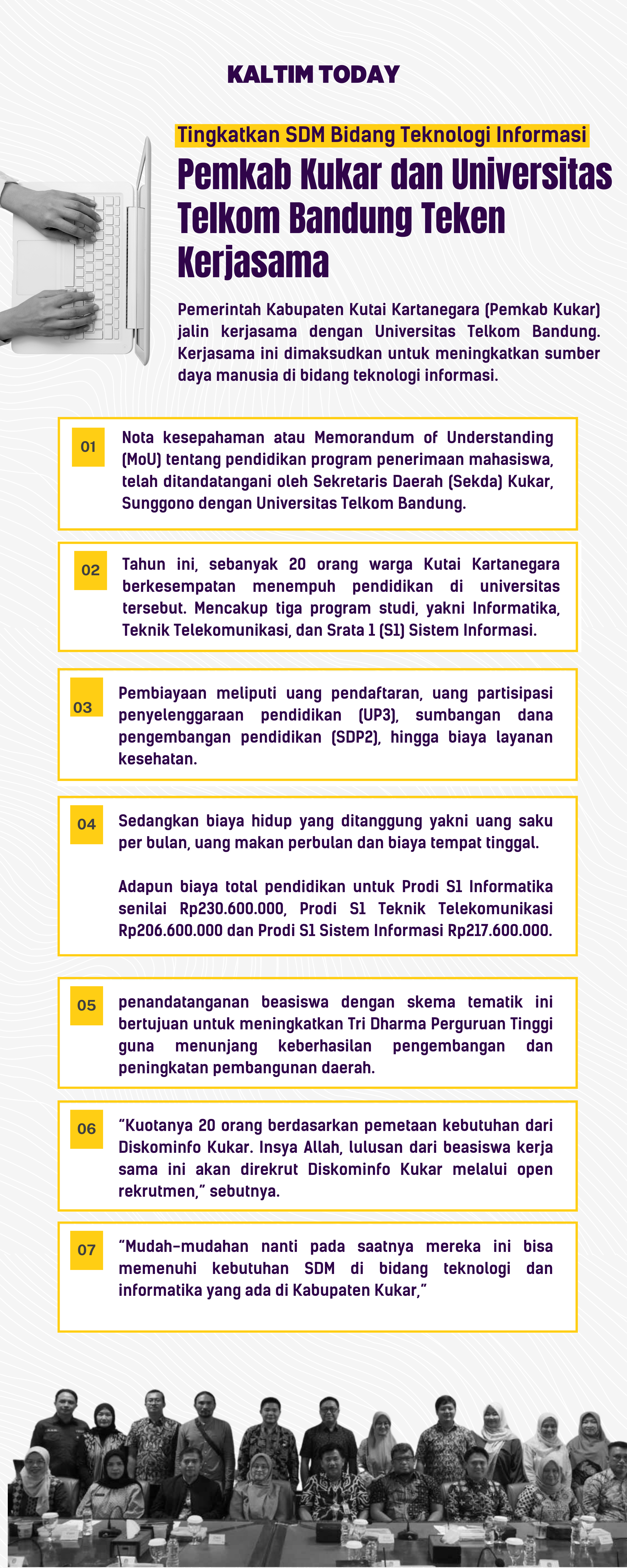 Kaltimtoday.co, Tenggarong - Pemkab Kutai Kartanegara (Pemkab Kukar) menandatangani MoU dengan Universitas Telkom, Bandung, Jawa Barat. Kerja sama ini dimaksudkan untuk meningkatkan sumber daya manusia di bidang teknologi informasi.
