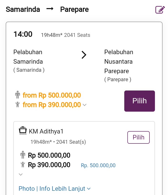 3. Pilih Kapal (contoh: KM Adhitya1), dengan harga tiket yang tertera.