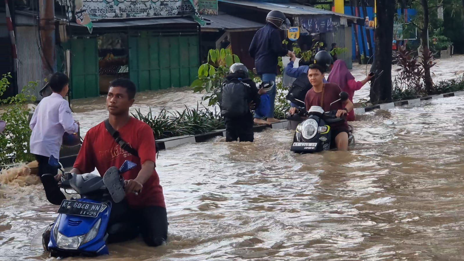 Banjir terjadi di beberapa titik, terutama di simpang Alaya, Jalan DI Panjaitan, Jalan Achmad Yani, dan Jalan Sentosa. Terlihat pengendara roda dua maupun roda empat yang tidak bisa lewat karena terjebak banjir.