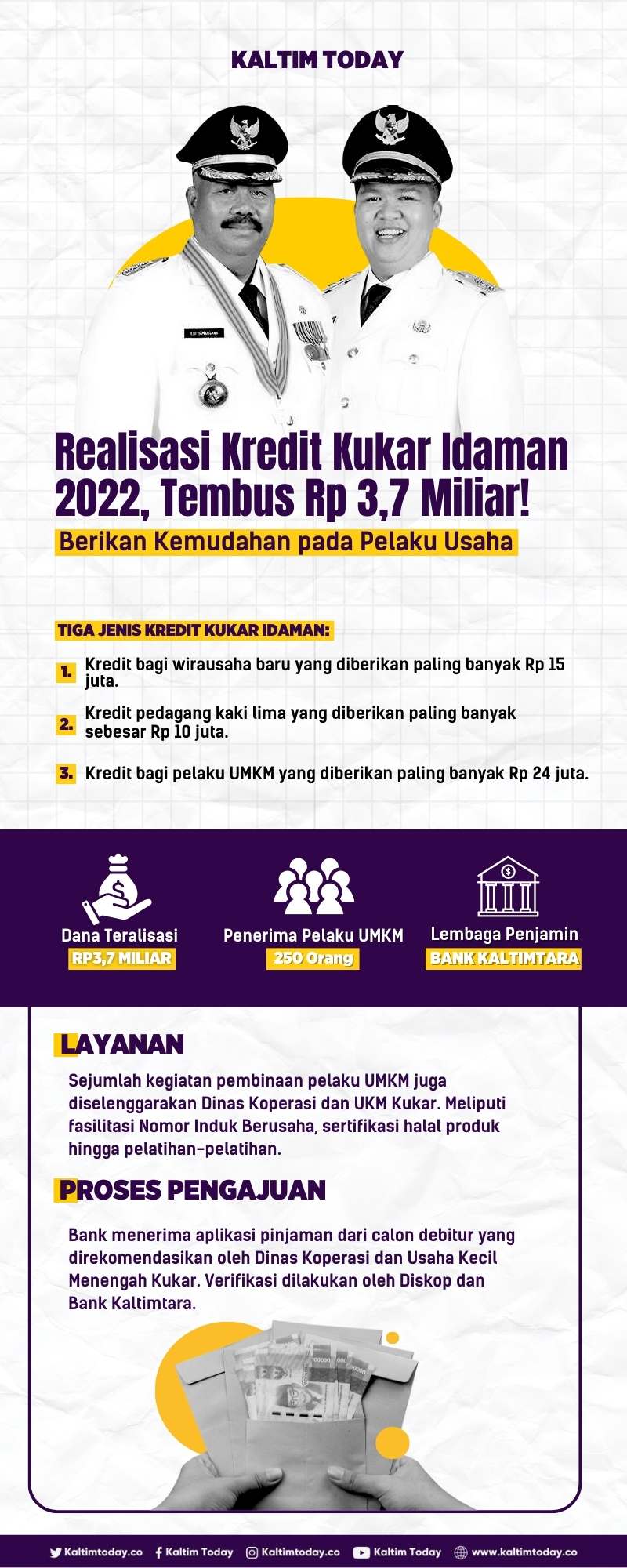 Berdasarkan data Dinas Koperasi dan Usaha Kecil Menengah (DiskopUKM) Kukar, pengajuan KKI mulai Januari hingga Desember 2022 sebanyak 737 pelaku UMKM. Total realisasi di angka kurang lebih Rp 3,7 miliar dengan jumlah 250 debitur.