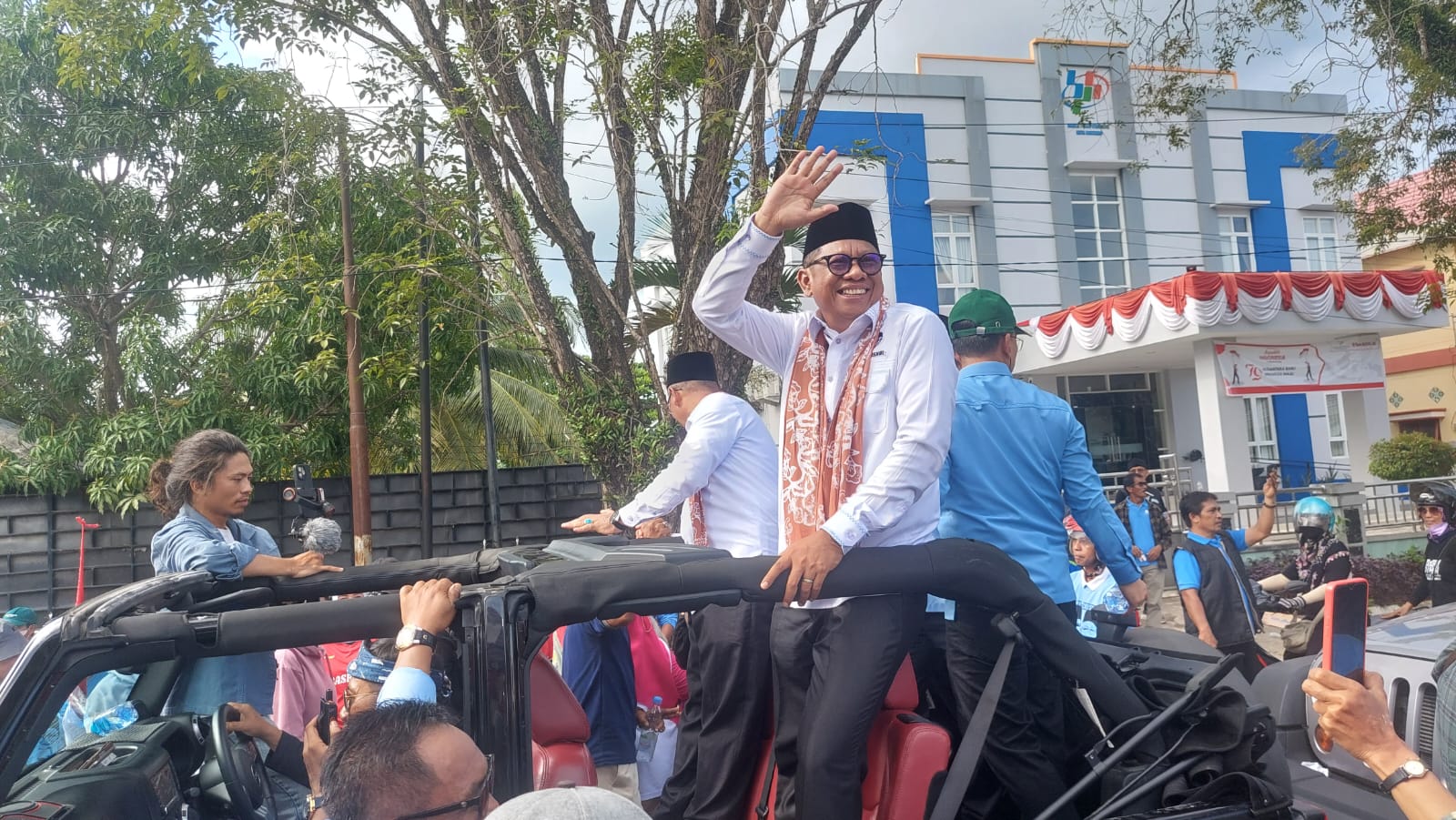 Pasangan independen ini tiba di KPU Bontang sekitar pukul 14.30 WITA. Kompak mengenakan kemeja putih, keduanya tiba dengan didampingi ribuan simpatisan dan diiringi musik rebana.