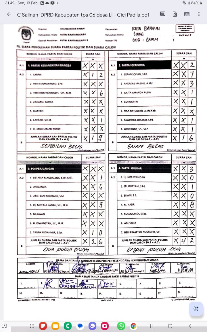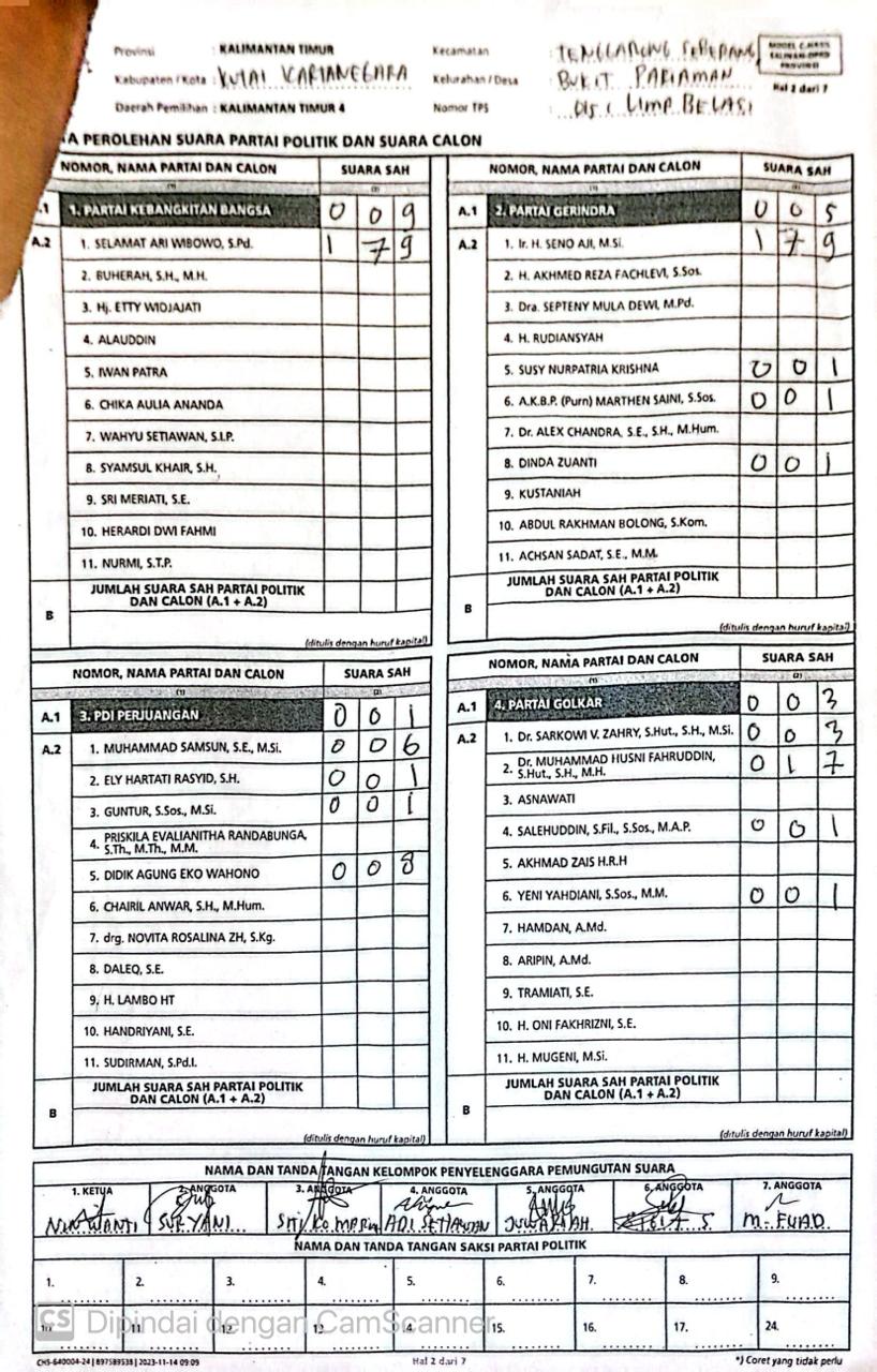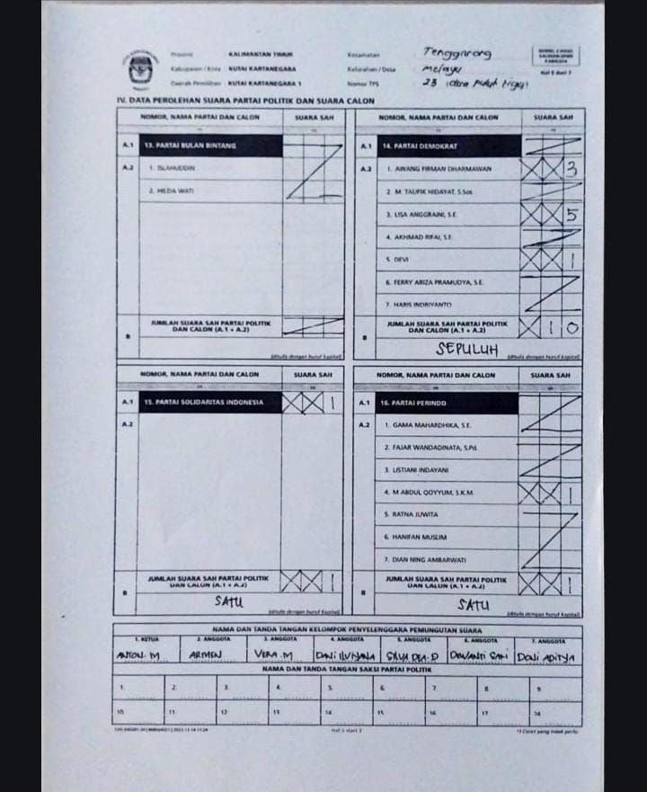 “Ini contohnya, di Kota Bangun, Desa Liang tepatnya di TPS 06, di situ ada jumlah suara Partai Golkar yang hanya 13, namun ada kesalahan dalam penjumlahan menjadi 42. Kemudian di Tenggarong, Kelurahan Melayu, tepatnya di TPS 23, di sana juga ada kesalahan penulisan jumlah suara Partai Demokrat. Bukan curang, itu kesalahan yang nantinya bisa dan akan diverikasi saat rapat pleno oleh semua pihak,” tutur Junaidi, menjelaskan dengan perincian bukti.