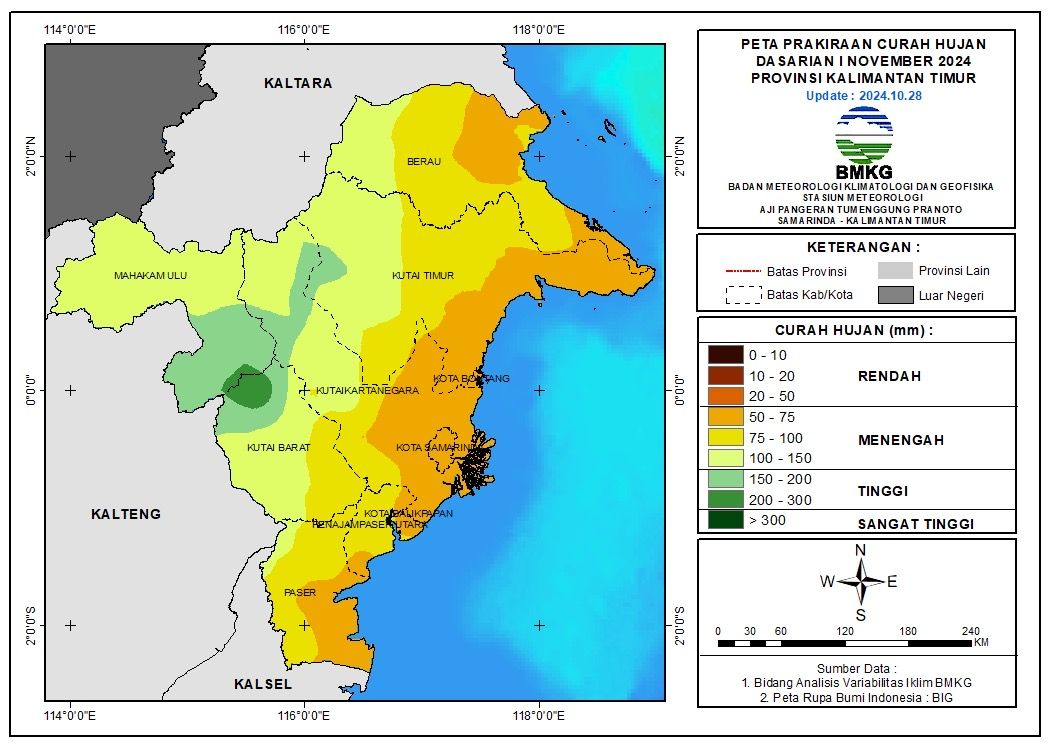 Prakiraan ini diperbarui pada 28 Oktober 2024 dan mengindikasikan bahwa intensitas hujan di Kaltim pada umumnya berada dalam kategori Normal (85-115 persen) hingga di atas Normal (116-200 persen) untuk awal November 2024.