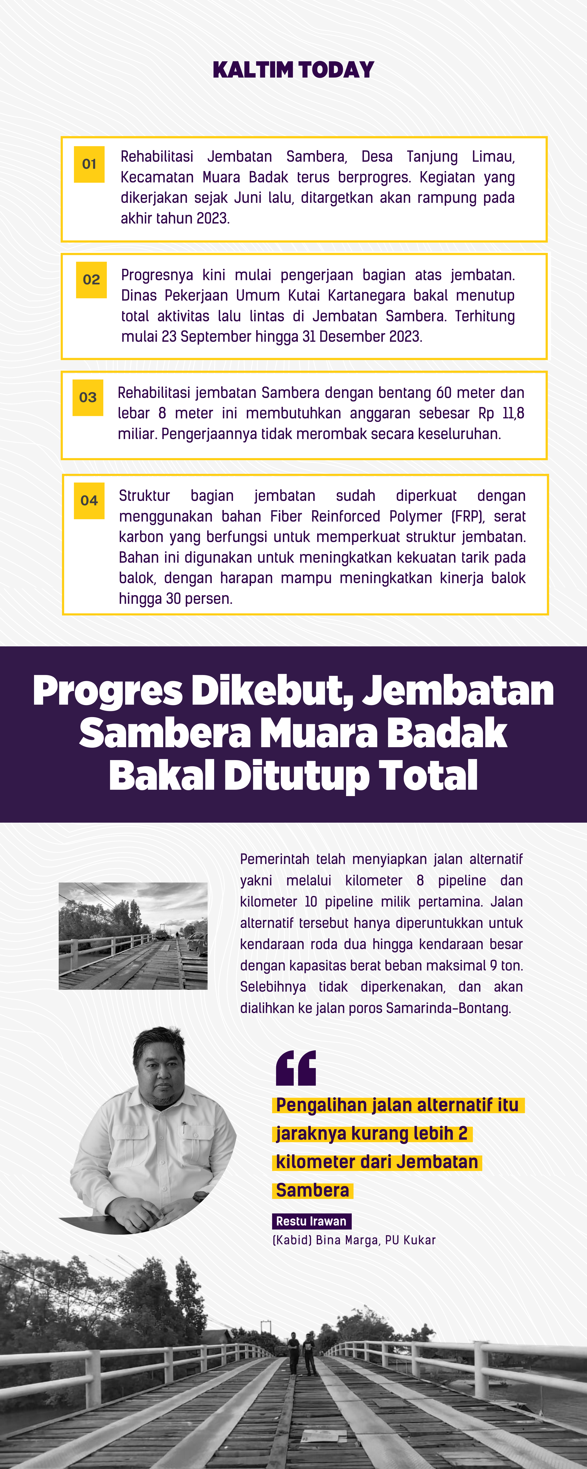 Progresnya kini mulai pengerjaan bagian atas jembatan. Dinas Pekerjaan Umum Kutai Kartanegara bakal menutup total aktivitas lalu lintas di Jembatan Sambera. Terhitung mulai 23 September hingga 31 Desember 2023.