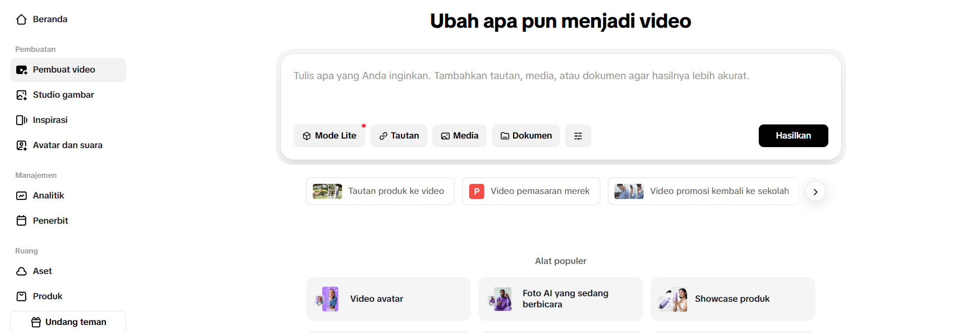 Mulailah dengan membuat akun Pippit, lalu masuk ke dashboard utama. Cari “Video generator” di menu kiri. Kamu punya dua opsi: masukkan link produk langsung ke kotak input, atau unggah file dari komputer dengan klik “Add media.”