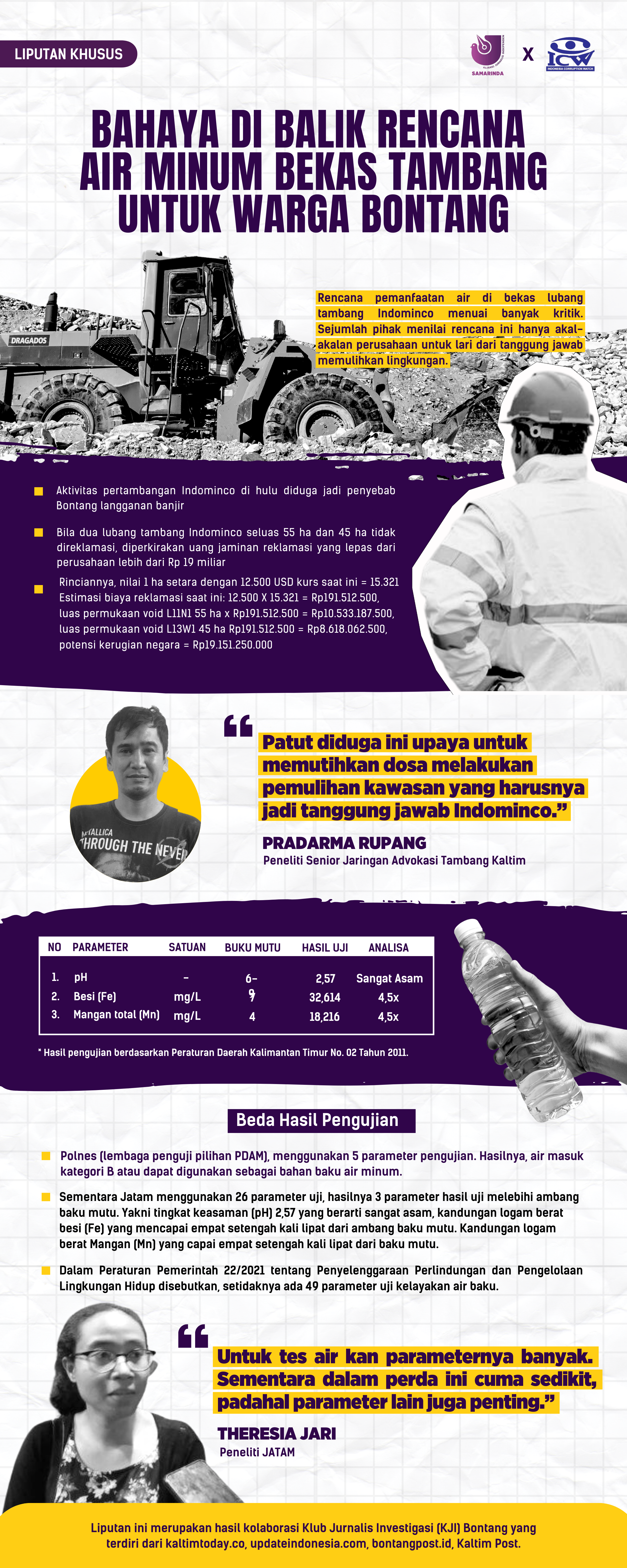 Pemkot Bontang, DPRD, hingga Perumda Tirta Taman terlihat cukup getol dan kompak mendukung realisasi rencana ini. Maret 2021, Polnes merilis hasil kajiannya terkait air di dua void Indominco. Mereka menyebut air laik digunakan, bahkan masuk kategori B alias layak untuk bahan baku air minum.