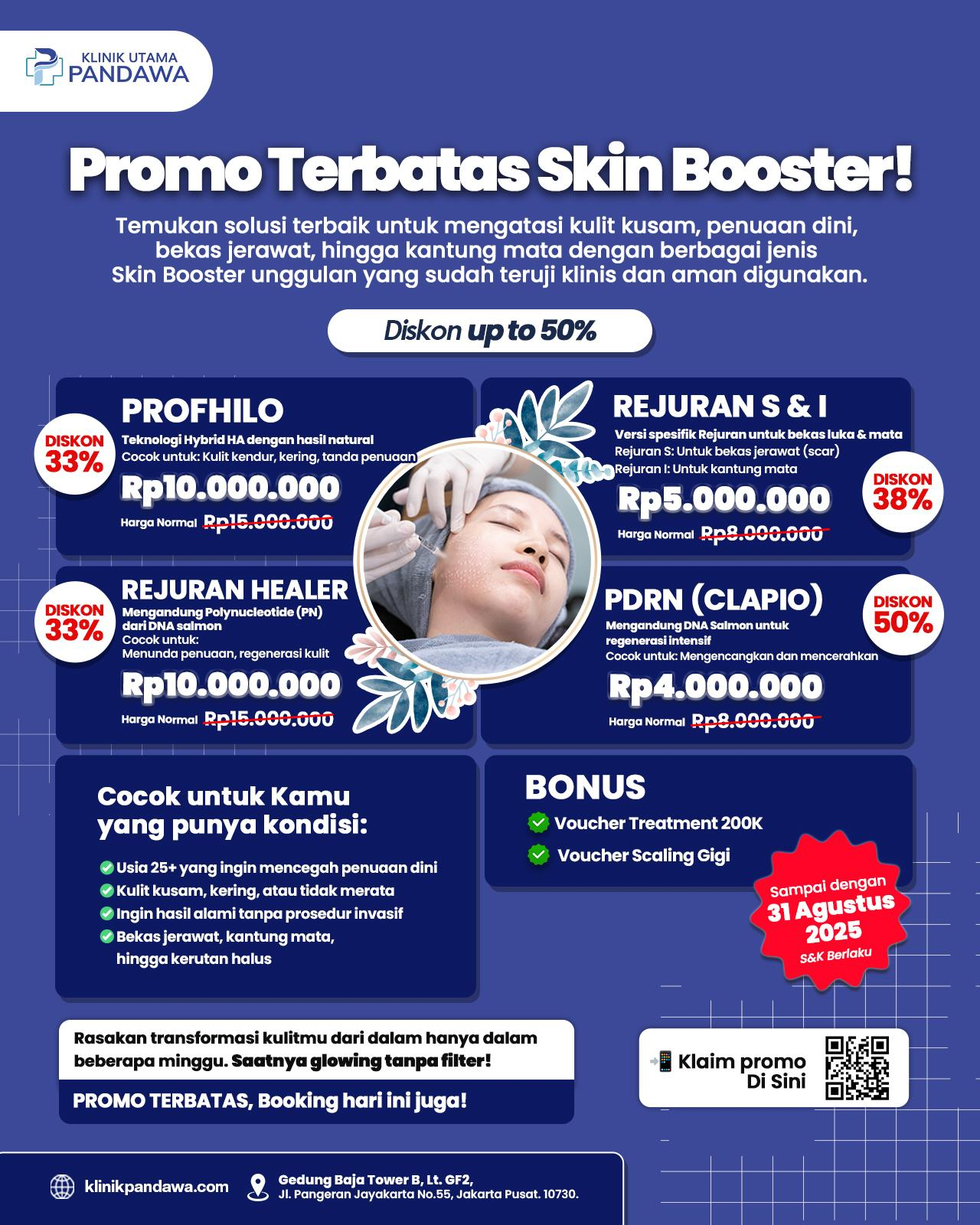 Segera kunjungi Klinik Utama Pandawa dan rasakan manfaat skin booster yang dapat memperbaiki tekstur kulit, mengurangi garis halus, serta memberikan efek glowing alami.