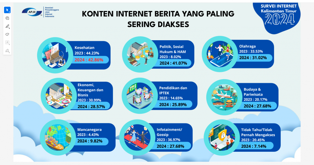 Kaltimtoday.co, Samarinda - Hasil Survei Penetrasi Internet 2024 yang dilakukan Asosiasi Penyelenggara Jasa Internet Indonesia (APJII) menunjukkan tren positif dalam penggunaan internet di Kalimantan Timur (Kaltim). Konten kesehatan dan olahraga menjadi primadona, mengungguli infotainment dan gossip yang biasa menduduki puncak di daerah lain.